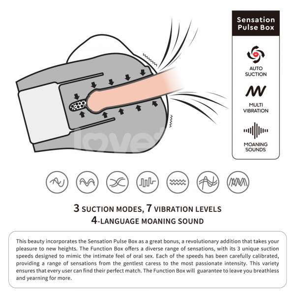 Мастурбатор имеет 7 разнообразных режимов вибрации, 3 режима вакуума и голосовое сопровождение на 4 языках!